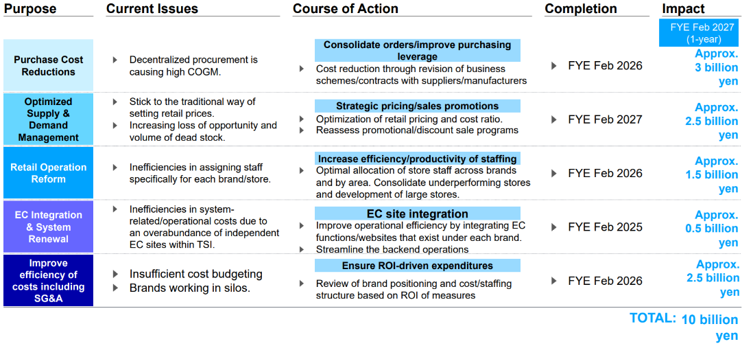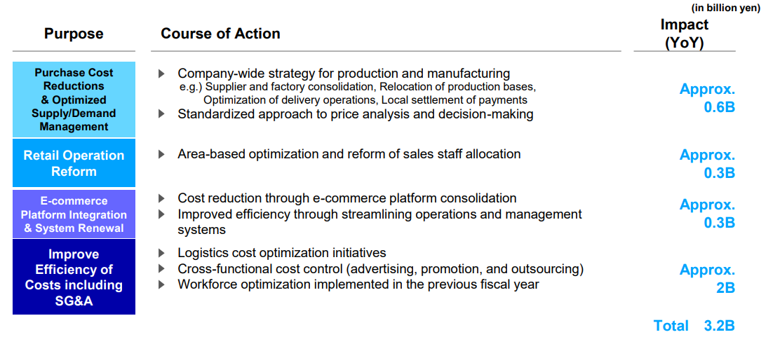 Despite a decline in sales, the profit margin improved 1.8 points year on year, owing to the effects of pricing and reductions of procurement costs, as well as the decrease in reserves for the negative effects of inventory evaluation due to the completion of the clearance of the inventories from past fiscal years. While structural reform seems to prove effective to a certain extent, it appears that the market remains unsure whether these effects will last, eespecially since the stock price dropped to a low after reaching high in the fiscal year ended February 2025.