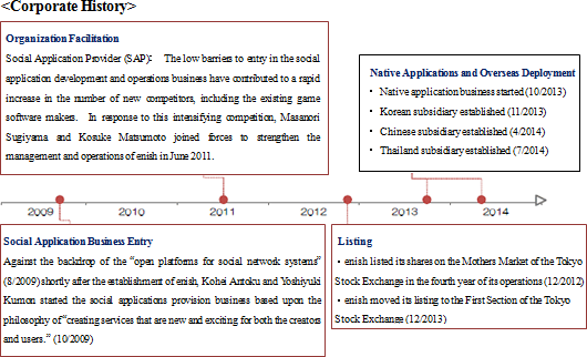 enish maintains only a single business segment entitled social applications business (Games are considered as one type of application category). Based upon foundation of the Company's earnings foundation built up in the browser application business, enish is also fortifying its efforts in the newer native applications business. While games are provided free of charge, various items including tools (In the case of "Bokuno Restaurant II," recipes and items to decorate the interior of restaurants can be purchased to make the games more fun to use and more attractive to virtual customers within the game) used in the games to make them more enjoyable are offered for purchase. Responsibility for collection of the fees charged to users for items purchased over browser applications is seconded to the social network services (SNS) platform providers, and fees are paid by enish to the platform providers as usage fees.