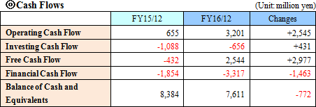 Sales were ¥16,851 million, up 0.2% from the previous term. The sales of the network service segment grew. However, the number of subscription renewals was sluggish in the system sales segment, which accounts for more than 60% of total sales. Gross margin rate dropped 1.9% due to the increased sales cost caused by the boost in equipment procurement, etc. SG&A, too, dropped from the same period of the preceding year thanks to cost control, but couldn't offset the decline in gross margin rate, and resulted in an operating income of ¥2,227 million, down 11.4% YOY. As a result of posting the compensation payment received amounting to ¥250 million as extraordinary income, and ¥159 million of the loss on the valuation of investments in the capital of subsidiaries and affiliates as extraordinary loss, net income decreased 8.7%. Neither sales nor profit reached the initial estimates. ![]() ![]() ![]() As for transactions, the number of maintenance facilities connected to the BL parts system was 2,041 at the end of the previous term, and the number of ordered systems of CarpodTab was 3,054, showing steady growth. The company aims to increase profitability further by selling the "BL parts system" and "CarpodTab" combined. ![]() Due to the increase of trade payables and unpaid corporate tax payments, etc., current liabilities increased ¥622 million. On the other hand, fixed liabilities decreased ¥636 million due to the drop in long-term debt, and total liabilities dropped ¥14 million to ¥6,165 million. Net assets decreased ¥1,472 million to ¥17,913 million, because of the decrease in retained earnings and the increase of treasury shares. As a result, equity ratio decreased 1.3% from the end of the previous term to 74.4%. The balance of interest-bearing debt decreased ¥655 million to ¥1,727 million. ![]() There is no income from long-term debt anymore and the deficit in financial CF augmented. The cash positon dropped. (4) Topics