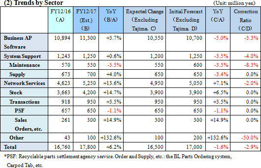 In addition to providing network work applications specialized for customer industries, maintenance service and supply products to mainly the automotive aftermarket industry, Broadleaf also carries out network services for its industry platform, consisting of the following three fields: 1) Business AP Software, 2) System Support and 3) Network Service.Since it is a single segment of the IT service business, the divisions shown below are carried out. ![]() The sales composition for December 2016 had Business AP Software account for the majority with 65.2%, but attempts are being made to increase the share of recurring fee revenues. (Composition of Sales Sectors) [Business AP Software] -Development and sales of specialized business applications -Development and sales of information security and other packaged software -Acquisition and sales of PCs, printers and other equipment [System Support] -Provision of maintenance services to clients that purchased Broadleaf's system -Acquisition and sales of ledger sheets and OA supplies, etc. [Network Service] -Provision of database services to clients that purchased Broadleaf's system -Provision of server services to clients that purchased Broadleaf's system -Provision of clearing house service for recycled auto parts. -Provision of electronic order functions for auto parts -Provision of tablet-based work support tools, etc. ![]() 1) Business AP Software