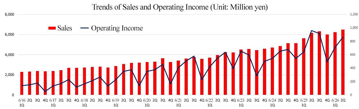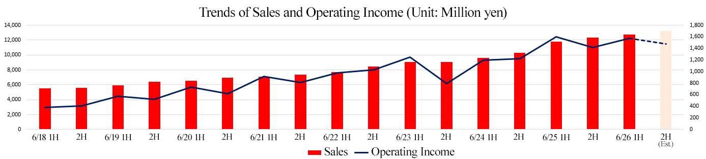 - In the first half of the fiscal year ending June 2026, sales increased 8.0% year on year to 12,753 million yen. While the Business Solutions Unit, Embedded Solutions Unit and the System Sales Business saw a revenue growth, the Product Solutions Unit experienced a decline in sales, partly due to the discontinuation of sales of software for producing New Year’s cards. Operating income decreased 1.9% year on year to 1,570 million yen. Although gross profit increased 3.5% year on year in parallel with the revenue growth, the increase in SG&A expenses due to strategic investments prevented operating income from growing, resulting in a slight decline. Despite the uncertain business environment, both sales and profit exceeded initial forecasts. Net sales reached a record high for both the first half and the quarterly basis.