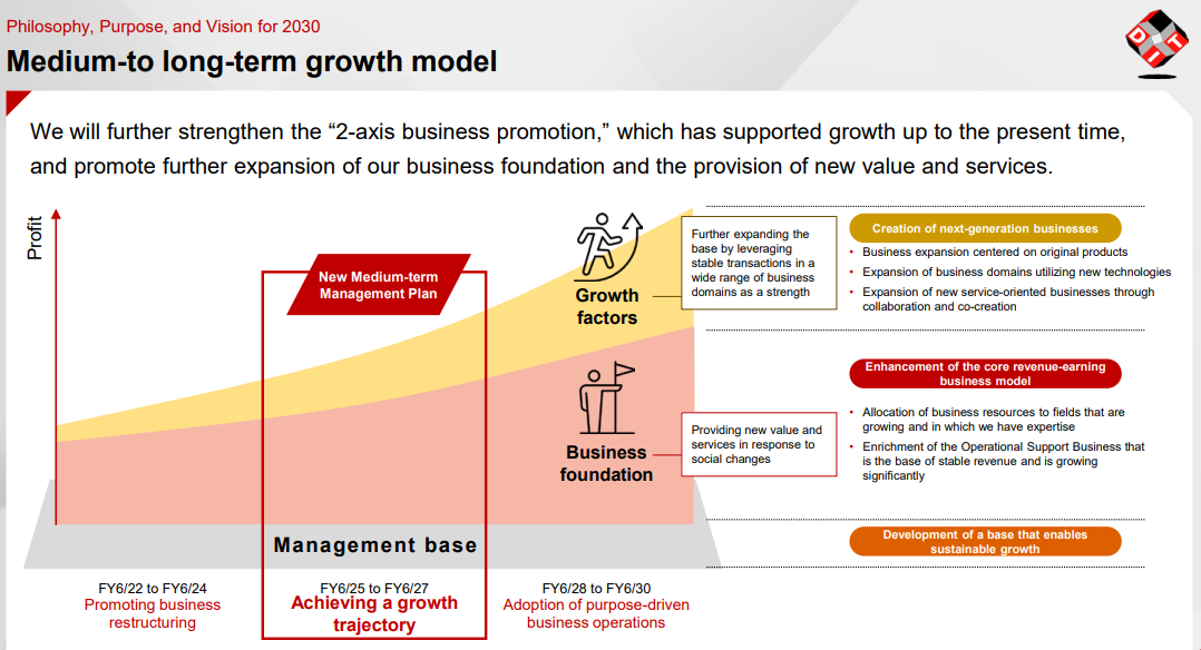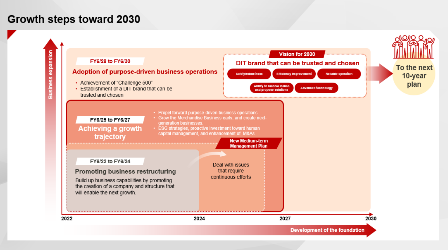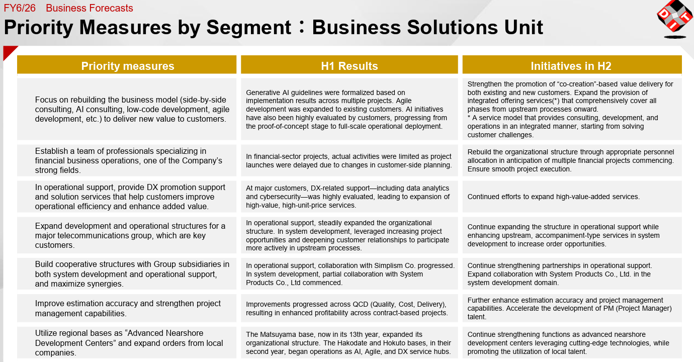 * | Profit margin | The operating income profit margin in the fiscal year ending June 2027 is projected to be 12% at the moment. Meanwhile, there is ample room for profitability improvement because the precision of project management can be increased and AI can be used in projects that DIT undertakes in the Business Solutions Unit, in addition to further growth of the Product Solutions Unit whose sales account for 10% of the total sales.