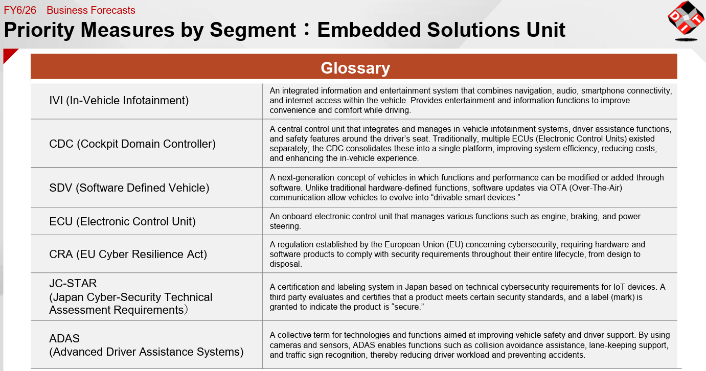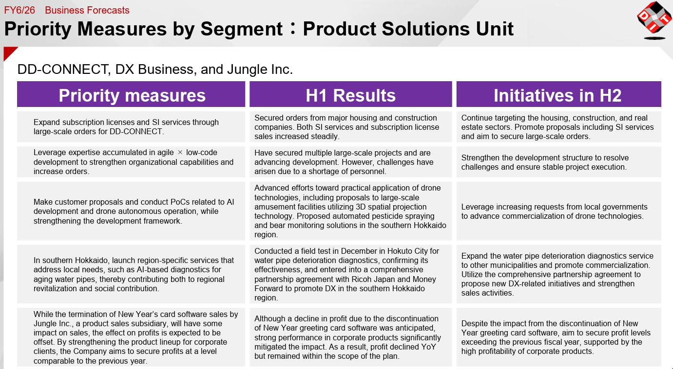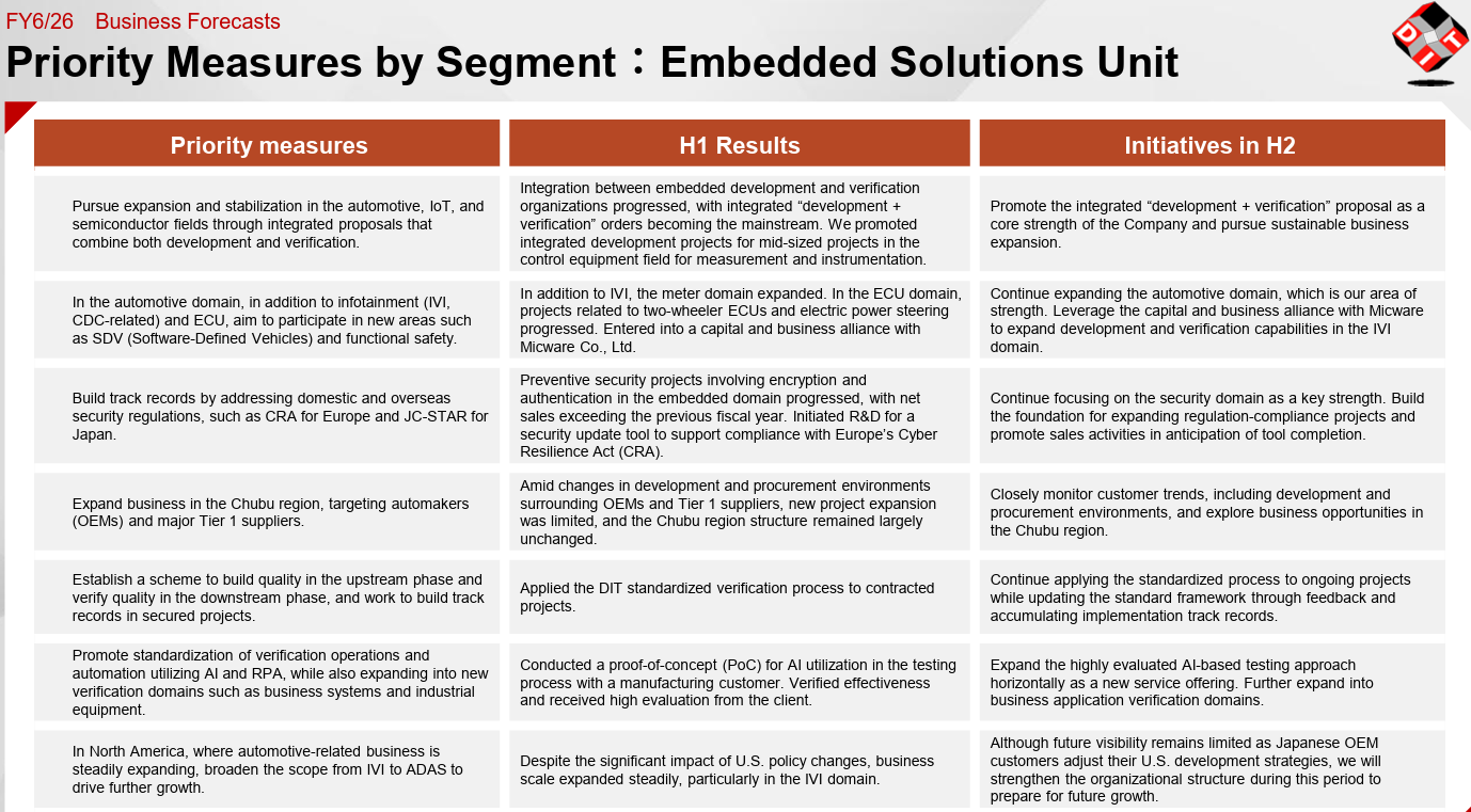 - Although enterprises are eager to invest in IT, they remain cautious about actually making investments due to the challenging environment surrounding their main customers, that is, automotive-related companies, which are affected by U.S. tariff policies, the situation in Iran, and trends in EV demand. On the other hand, the Business Solutions Unit is securing new projects in the telecommunications sector and other areas, while the Embedded Solutions Unit is recovering as its business expands beyond the automotive sector. The progress rate in the first half of the fiscal year stands at 49.1% for sales and 51.5% for operating income. These figures are comparable to those in the previous years, and attention will be focused on how much sales and profits can be accumulated in the third and fourth quarters, with the Business Solutions Unit serving as the driving force.