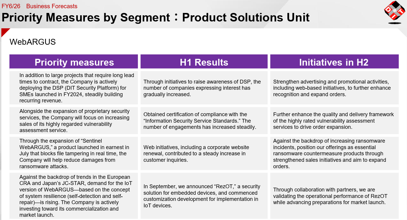 In July 2025, the company has begun full-scale operation of SentinelARGUS, which is mounted with the functions to prevent spread of damage caused by ransomware and block unauthorized access to important data, as a new product that satisfies the needs in the security products market. Furthermore, the company is propelling forward research and development of solutions for comprehensively protecting the container operation environment.