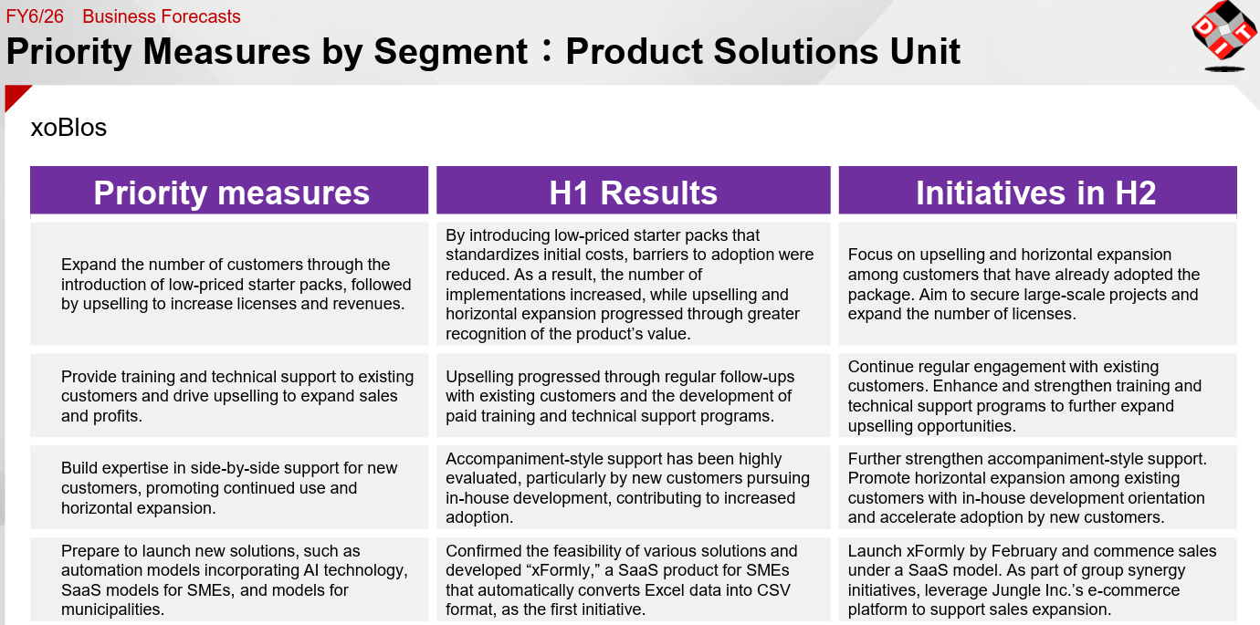 For xoBlos, they aim to increase the number of corporate users, particularly large companies, and to expand subscription license fees.