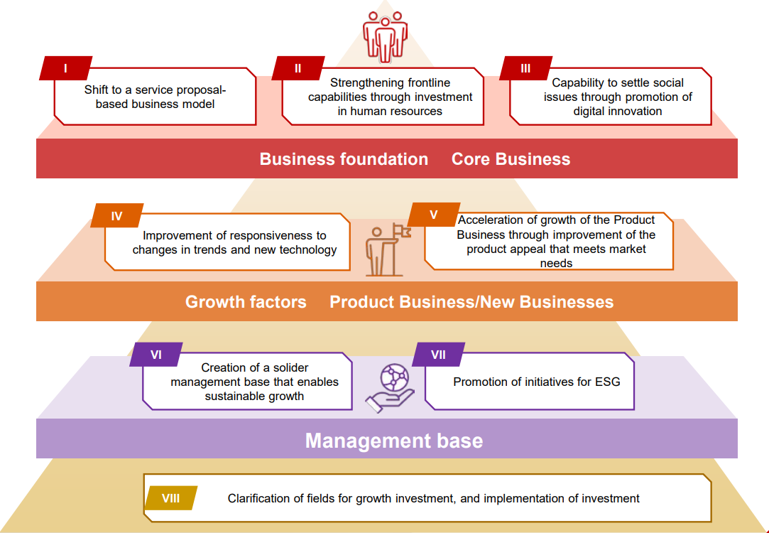 Recognizing the challenges from the previous medium-term plan as “further strengthening the management foundation to enable sustainable growth,” “promoting ESG initiatives” and “clarifying growth investment areas and executing investments,” the company will set up group-wide committees such as “Human Value Enhancement” Committee, “Sustainable Management Review” Committee, “New Technology R&D” Committee, “Project Quality Management Enhancement” Committee and “Internal Environmental DX Review” Committee, to work on these issues with a higher priority.