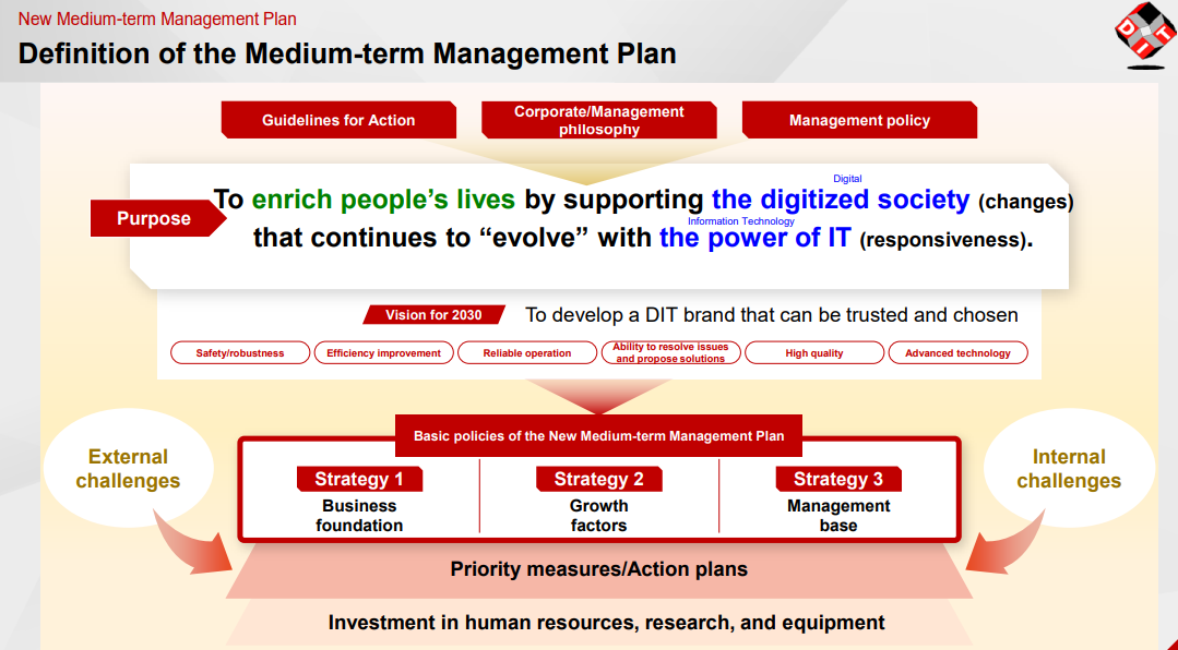 <Principle 3-1> | (ⅰ) Our management philosophy, business strategies, and business plans are disclosed at financial results briefings and on our webpage (at the following URL). Information for financial results briefings https://www.ditgroup.jp/ir/kessan.html