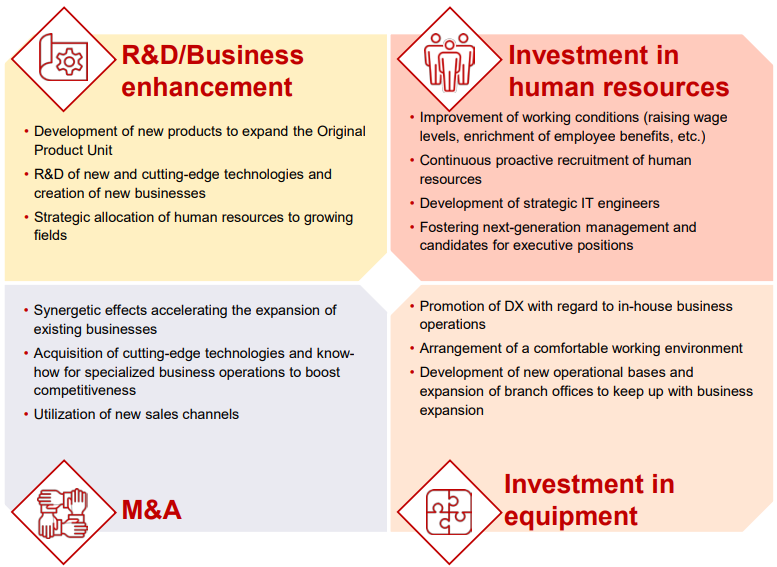 To pursue growth, the company will implement four investments - “R&D and business enhancement,” “investment in human resources,” “M&A” and “capital investment,” to establish a foundation for sustainable growth over the medium/long term.