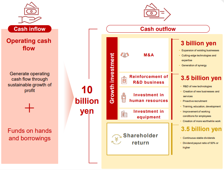 Among these, the focus will be on R&D for the creation of new businesses, investment in the expansion of growing areas, and investment in human resources to increase human value.