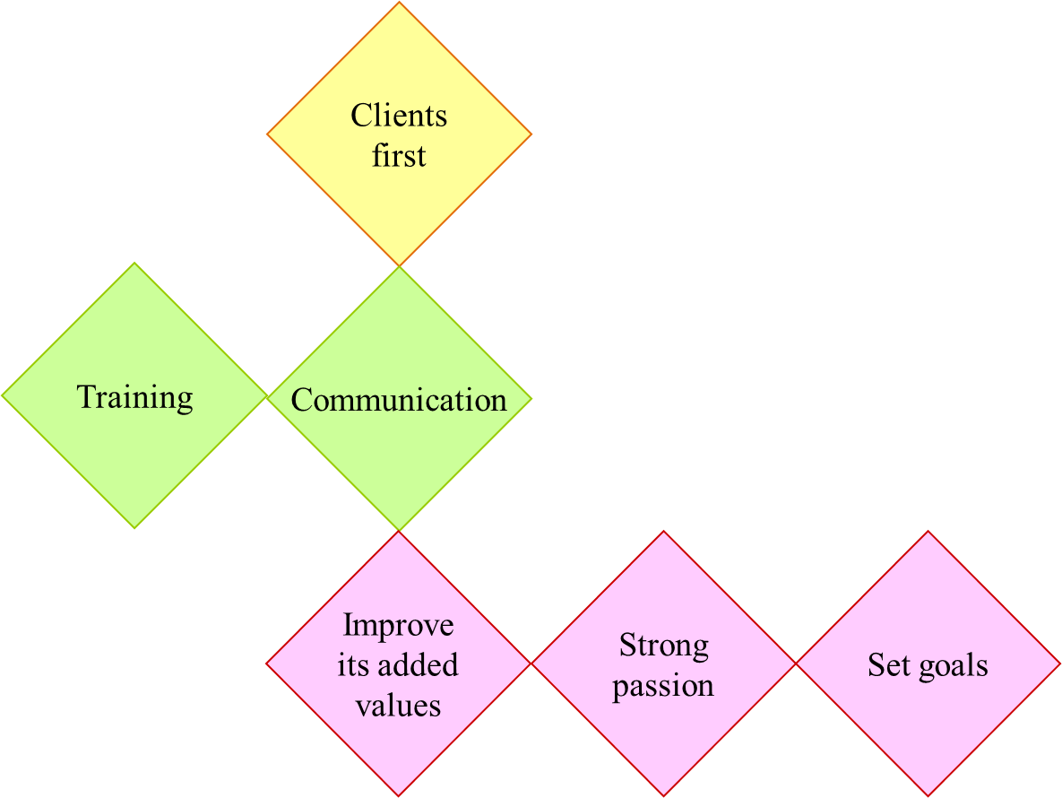 Our logo is a collection of cubes with an infinite number of stairs. This collection is our company itself, and each cube represents each employee. The 6 facets of the cubes represent six values which all employees share and consider valuable. Our corporate identity represents these values in three tiers; clients, company and employees. |