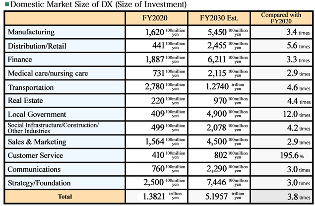 IT solutions that contribute to labor elimination and operational efficiency improvement, especially DX, are becoming increasingly important issues for companies, and according to a survey by Fuji Chimera Research Institute, Inc., active investment is being made in DX in every industry. The domestic DX market in 2030 is expected to expand to 5.2 trillion yen, 3.8 times the amount in fiscal year 2020.