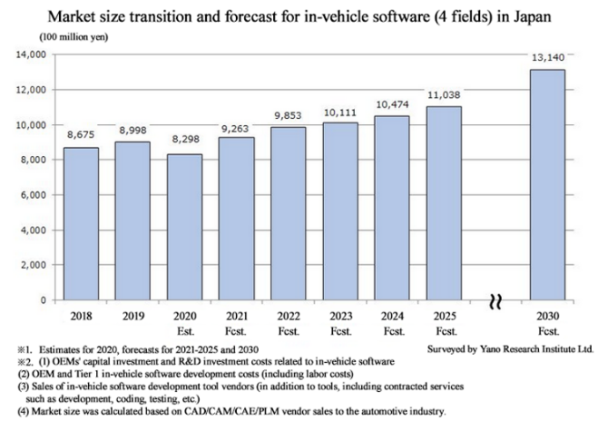 According to the Yano Research Institute Ltd., the market for domestic in-vehicle software continued to expand until 2019, but new car sales decreased in 2020 due to COVID-19.