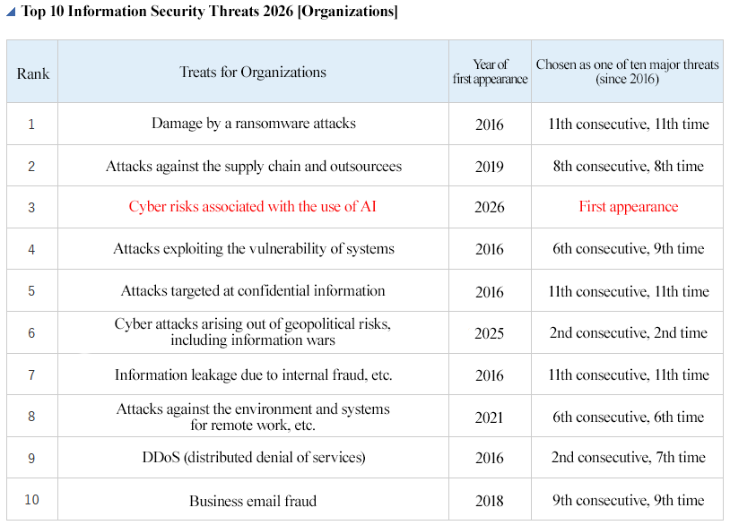 Every year, the Information-technology Promotion Agency, Japan (IPA) selects threat candidates from information security incidents that occurred in the previous year and are considered to have had a large impact on society and forms the “Top 10 Threats Selection Committee,” consisting of approximately 250 members including information security field researchers and business executives, which deliberates and votes on threat candidates, and then determines and announces the “Top 10 Information Security Threats.” In the “Top 10 Information Security Threats 2026,” based on the threats that occurred in 2025, “damage caused by ransomware” was ranked first in the organizational field for the sixth consecutive year from 2021. Thus, it is a major threat to society. In addition, “cyber risks associated with the use of AI” ranked third for the first time. The need to constantly update information security systems is also increasing.