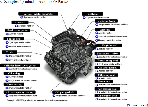 <Example of final product : Tires>Zeon provides the world's leading tire manufacturers with the world's highest-quality synthetic rubber for use in tires. Among the various types of synthetic rubber manufactured are styrene butadiene rubber (SBR), which promotes superior abrasion resistance, aging resistance and mechanical strength properties, butadiene rubber (BR), which includes a superior balance between elasticity, wear and low-temperature properties, and isoprene rubber (IR), which features similar high levels of quality, consistency and other properties as natural rubber. Zeon expects the demand for S-SBR for low fuel consumption tires, which further improved the characteristics of SBR, to expand rapidly in the future. In order to increase the supply capacity corresponding to this, Singapore plant started operation in September 2013 (the first line). The second line started operation in April 2016. The supply capacity of the Singapore plant is 70,000 tons. ![]() Furthermore, a new grade of Zetpol® has vastly improved the performance of products using the original versions of Zetpol®. Products using the new grade of Zetpol® are heat resistant at temperatures that exceed the limits for the original version of Zetpol® by 15 degrees centigrade, thereby extending the life of seals and gaskets, and are in strong demand for use in next generation bio-fuel engines. The new grade of Zetpol® is well suited to extrusion processing which is being leveraged to expand its usage in various hoses. Products using Zetpol® have also been well received by customers, and are being used increasingly as a replacement material for more expensive competitive rubber in Japan, Asia, Europe and North America. Commercial production of the new Zetpol® started in November 2012 at Zeon's Kawasaki Plant and reached full-scale production in 2013. ②Synthetic Latex Business