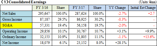 Sales declined by ¥8.0 billion year-on-year to ¥287.6 billion during fiscal year March 2017. While increases in sales of optical film for television applications and battery materials contributed an additional ¥8.0 billion to sales, deterioration in overseas market pricing and declines in pricing of elastomer products, and foreign exchange related factors led to sales losses of ¥6.6 and ¥9.4 billion respectively. Operating income rose by ¥0.9 to ¥30.7 billion. Pricing declines and foreign exchange depressed profits by ¥6.6 and ¥9.4 billion respectively, but lower raw material costs and economies of scale boosted profits by ¥10.6 and ¥5.1 billion respectively. Ordinary income declined by ¥0.3 to ¥31.8 billion. Foreign exchange related loss expanded to ¥0.9 billion. Net income rose by ¥5.1 to ¥23.2 billion due in part to a reduction in loss from liquidation of affiliated companies to ¥0.5 billion in the current term from ¥3.6 billion in the previous term. ![]() Sales volumes of rubber materials fell by 4%, and general use rubber used in tires fell by 2% year-on-year respectively. Sales within Japan decline by 9% due to the Japanese tire manufacturers' capacity utilization rates decline. Export sales rise by 4% by the strong demand for S-SBR and a recovery in market conditions after the start of the fourth quarter. Specialty rubber declined by 6% year-on-year. Sales within Japan rose by 5%, but worsening market conditions caused overseas sales to decline by 11%. The sales composition of specialty rubber in terms of volume and value declined by 1% and 4% points to 30% and 54% respectively. Latex saw a 2% decline in volumes. Sales volumes of resin modifier applications declined due to utilization rate conditions of customers. Chemical products saw a 3% increase in sales volumes, but sales value fell on the back of worsening overseas market conditions and strengthening in the Japanese yen. ![]() The increase in sales of Specialty Chemicals section is attributed to a 1% year-on-year increase in electronic materials and a strong 38% in battery material exports. Chemical products sales rose by 3%, but toner sales declined by 3% due to the "paperless" trend. Within the specialty plastics business, optical film sales rose by 8% year-on-year, but COP resin sales fell by 8% year-on-year. Sales volumes of optical films for television applications rose by 21% year-on-year. Inventory adjustments for small to medium sized applications contributed to a large decline in sales composition from 37% in the previous term to 18% in the current term. ![]() ![]() An additional ¥0.8 billion in sales were derived from higher sales volumes, and ¥4.0 and ¥1.8 billion from pricing factors and foreign exchange respectively. The sales decline in specialty material business is attributed to declines in sales volumes of optical film for television applications. Higher cost of sales and lower sales volumes negatively influenced operating income to the tune of ¥3.6 and ¥0.9 billion respectively. At the same time, pricing and foreign exchange positively influenced operating income to the tune of ¥4.0 and ¥1.8 billion. ![]() ![]() While payables increased, declines in long term interest bearing liabilities amounting to ¥11.8 billion caused total liabilities to fall by ¥2.3 billion. Declines in foreign exchange adjustment accounts due to the stronger yen, increases in shareholders' equity due to increases in retainer earnings, and an increase in other marketable securities valuation gains contributed to a ¥29.0 billion increase in net assets. Consequent to these developments, capital adequacy ratio fell by 3.6% points from the end of the previous term to 58.4% at the end of the current term. ![]() Despite acquisition of tangible assets, the margin of outflow of investing cash flow contracted by ¥5.7 to ¥29.1 billion. The margin of net inflow of free cash flow grew by ¥7.1 to ¥19.9 billion. Acquisition of treasury stock declined but reduction in interest bearing liabilities caused the net outflow of financing cash flow to expand by ¥6.8 to ¥15.8 billion. At the same time, cash position rose. |