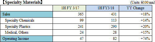 Sales were ¥166.6 billion, up ¥26.4 billion year-on-year. The effects of the increase in quantity sold and price effects raised sales by ¥18.8 billion and ¥6.2 billion, respectively. As for elastomers, general-purpose rubber for export and special rubber sold well. As for specialty materials, the performance of diagonally stretched films for small and medium-sized displays was favorable.Operating income grew ¥6.6 billion year-on-year to ¥19.9 billion. The effects of the increase in quantity sold and price effects raised profit by ¥5.2 billion and ¥6.2 billion, respectively, while the augmentation of cost due to the rise in prices of Japan naphtha and Asia butadiene decreased profit by ¥4.4 billion. Ordinary income grew ¥9.5 billion year-on-year to ¥21.6 billion. An exchange gain of ¥600 million was posted, while an exchange loss of ¥1.8 billion was recorded in the same period of the previous year. Both sales and profit exceeded the respective initial estimates considerably. ![]() The quantity sold of rubber increased 16%. The quantity sold of general-purpose rubber for tires grew 20% year-on-year. In Japan, the quantity sold dropped 4% year-on-year, because the factory utilization rate of each tire manufacturer was sluggish, but outside Japan, it increased 38% year-on-year, as SSBR was healthy and the market was thriving. The sales volume of special rubber rose 3% year-on-year. Inside Japan, it increased 3%, while outside Japan, it rose 4% although it dropped 1% in the first quarter. The ratio of special rubber declined 4% to 27% in terms of quantity sold, and dropped 6% to 51% in terms of sales. As for latex, the materials for gloves exported well. ![]() As for the breakdown of sales growth of the segment of specialty chemicals, the sales of electronic materials increased 16% year-on-year, while the sales of battery materials grew 37% year-on-year, because the performance of materials for in-vehicle batteries was favorable. The sales of chemicals decreased 2% year-on-year, while the sales of toners recovered to 13% increase. The sales of the segment of specialty plastics rose 20% year-on-year. The sales of COP resin grew 4% year-on-year. The sales of optical films increased 26% year-on-year, as the films for small and medium-sized displays sold well. The quantity sold increased 10% year-on-year. The ratio of sales for small and medium-sized displays rose from 19% to 28%. ![]() ![]() The quantity sold factor increased sales by ¥2.7 billion, the price factor decreased sales by ¥1.8 billion, and the exchange rate factor raised sales by ¥200 million. Quantity sold did not influence operating income, and price factor decreased operating income by ¥1.8 billion. The cost factor and exchange rate factor increased operating income by ¥2.4 billion and ¥200 million, respectively. ![]() ![]() Total liabilities augmented ¥4.4 billion from the end of the previous term, as interest-bearing liabilities declined ¥1.9 billion and payables rose ¥4.4 billion from the end of the previous term. Net assets grew ¥18.9 billion, due to the increase in retained earnings and valuation difference on available-for-sale securities. As a result, capital adequacy ratio rose 1.1 points from the end of the previous term to 59.5%. ![]() |