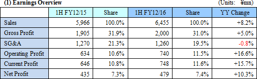 Sales rose by 8.2% year-on-year to ¥6.455 billion.Within Japan, demand for Standard Bottles continues to expand with increases in new projects contributing to growth in sales. Favorable demand from repeat customers of cosmetic product applications and aggressive development proposal based marketing allowed development of both Standard Bottles and Custom Bottles to grow. At the same time, the recent increases in extrusion tube manufacturing capacity made in May 2015 are expected to contribute positively to earnings on a full year basis. While new projects trended favorably in China, new product sales were delayed. Foreign exchange translation gains declined by ¥182 million due to the strengthening of the yen relative to the Chinese yuan. Operating profit rose by 16.6% year-on-year to ¥740 million. This growth in operating profit is attributed to both higher sales within Japan and declines in raw materials costs of plastics. And while raw materials costs also declined in China, foreign exchange translation declined by ¥24 million. ![]() ![]() Growth in both short and long term debt contributed to a rise in total liabilities of ¥992 million to ¥5.482 billion. Retained earnings grew, but strengthening of the yen contributed to a ¥93 million decline in foreign exchange translation provisions to ¥5.482 billion. Consequently, capital adequacy ratio declined by 4.7% points from the end of the previous fiscal year to 46.2% at the end of the current first half. ![]() Increases in tangible assets contributed to expansions in the net outflows of both investing and free cash flows. An increase in short and long term debts allowed the net outflow of financing cash flow seen in the previous first half to turn to a net inflow during the current first half. Consequent to these developments, cash position rose by ¥298 million to ¥1.556 billion. (4) Topics