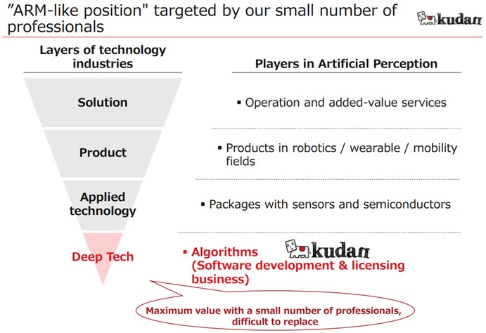 - Kudan Inc. is a company that carries out research and development of deep technology specializing in the algorithms for artificial perception (AP), which corresponds to the “eyes” of machines (computers and robots). Its strengths and characteristics include the capability of flexibly responding to the growth of diverse demand, which is expected in the future, and a group of professionals in AP.