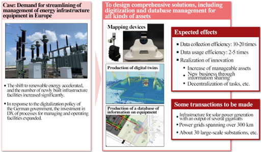Management of facilities and equipment Maintenance and inspection of infrastructure | By promoting digital transformation (DX) in the fields where DX has been difficult, they automate and streamline business operations and make it possible to work remotely. Demand is expected to grow, as it is necessary to deal with the shortage of on-site workers and the deterioration of equipment infrastructure, which are common in advanced countries. |