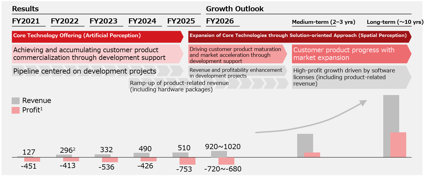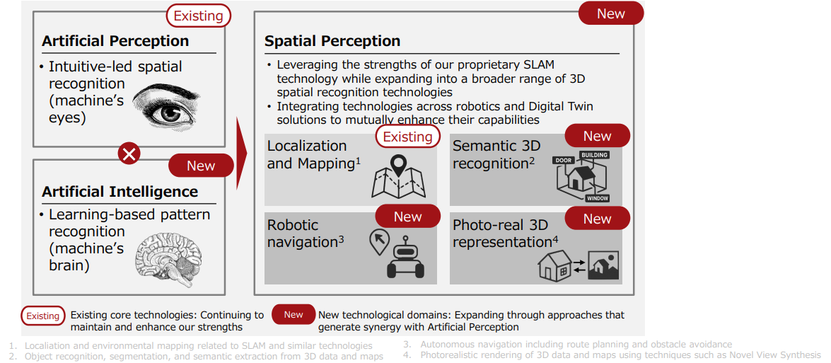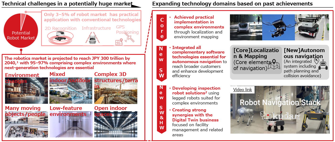 - While the number of products released by clients increased until the fiscal year ended March 2025 and Kudan’s performance improved for medium/long-term growth, the sales from product licenses for robots in commercialization projects were sluggish due to the insufficient maturity levels of complementary technologies and eco-systems. In the fiscal year ending March 2026, they switched to a growth strategy of adopting new technologies and complementary technologies for offering solutions in order to improve their profitability and growth potential to keep up with the market pace. The key points are “the expansion of software technologies for spatial perception” and “the utilization of the hardware package,” and they keep concentrating on the improvement of productivity based on the “digital twin” technology, which duplicates a real-world item in the digital space, and “robotics,” where robots perceive real space digitally.