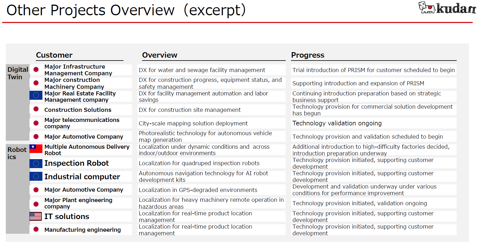 Kudan began offering Kudan Indirect Visual SLAM under the name of Kudan SLAM in the term ended March 2018. Then, it started to provide Kudan 3D-Lidar SLAM in March 2020. The company has been striving to broaden the customer base in the following three areas: