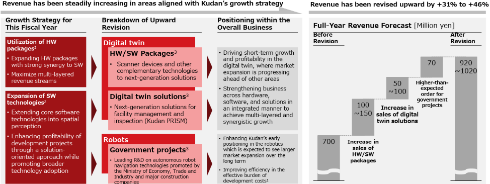 - In the first half of the fiscal year ending March 2026, sales grew considerably. Sales rose 170.2% year on year to 400 million yen, and operating loss was 416 million yen (437 million yen in the previous fiscal year). While the market is changing rapidly, their business strategies started this fiscal yea “the expansion of software technologies” and “the utilization of the hardware package” have turned out to be effective. The digital twin and robot businesses of Kudan, which has secured a leading-edge position in the market, have accelerated.