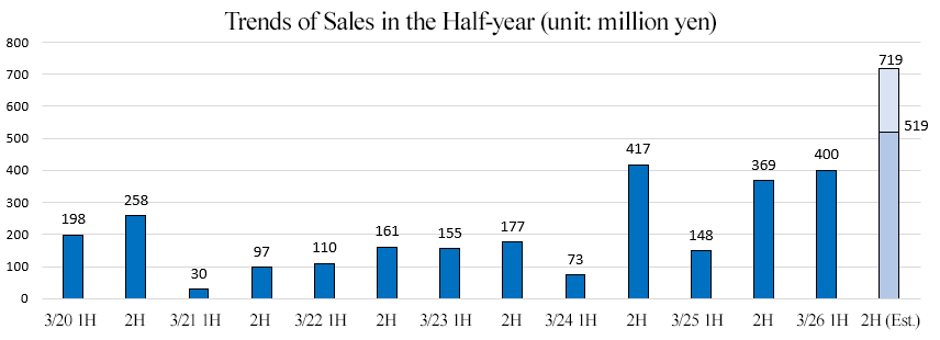 - Through the upward revision to the forecast sales, the projected profit has increased by 80 to 120 million yen, but due to the delay in cost reduction, etc., the forecast annual profit has increased by only 0-40 million yen. On the other hand, the reduction of costs, including fixed costs, will be completed by the end of this fiscal year, so it is expected that profitability will improve significantly by the end of this fiscal year, and in the fiscal year ending March 2027, the sales growth will contribute and annual deficit will shrink considerably by 300-350 million yen. As adjusted operating loss is expected to be 350-400 million yen, they consider that the prospect for moving into the black will become clear.