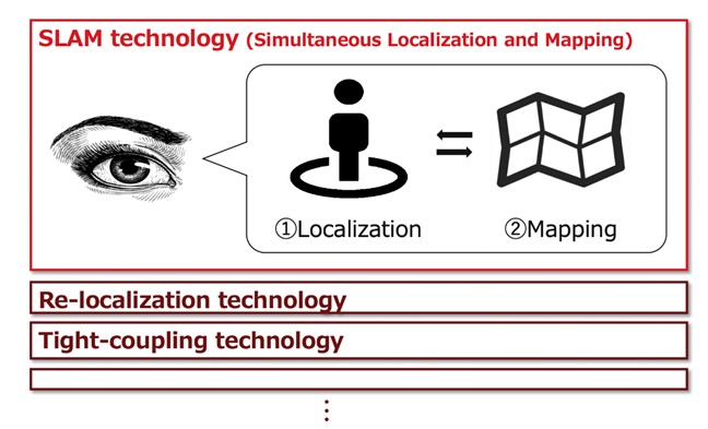 SLAM is a technology for each computer to concurrently “estimate the self-location (localization: checking where you are)” and “produce an environmental map (mapping: checking your surroundings)” in the real environment based on data input from external sensors, such as cameras and lidar.