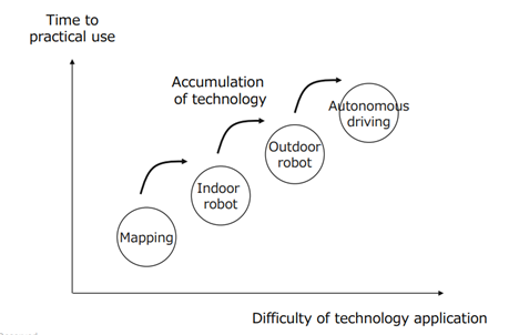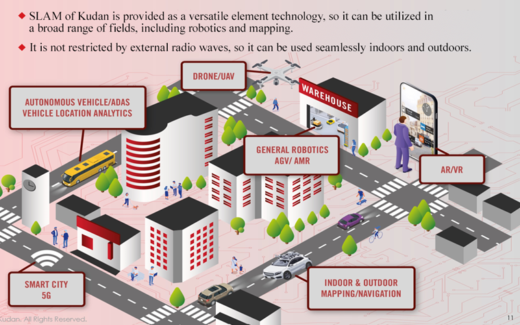 Kudan Indirect Visual SLAM, for example, is capable of processing information over 10 times faster with less processing power than the most prominent open-source software of camera-based SLAM technology. Compared to other solutions that can generally give only centimeter-level localization precision, such as 5 cm, the precision of Kudan Indirect Visual SLAM can be as small as millimeters. By combining these algorithms, etc., the company aims to further improve the function with higher speed and higher precision both indoors and outdoors, using multiple sensors, such as cameras and Lidar, together by integrating the systems through clock synchronization between the sensors (a process called tight coupling). This technological superiority has been enhanced further by the acquisition of Kudan Germany (former Artisense Corporation) as its subsidiary as mentioned later.