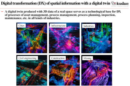 In addition, the technology will be applied to an extremely wide range of purposes as the base technology for next-generation digital maps, dynamic maps (a dynamic mapping system that swiftly reflects the conditions of the reality environment), digital twin (information on the virtual space synchronized with the reality environment on a real time basis), and the like.