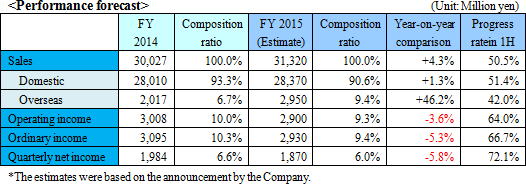 Net sales were 15.8 billion yen, up 5.0% year-on-year. Domestic sales were affected by a rebound from the increased demand before the consumption tax increase in Q1, but recovered from June onwards. By product, general test reagents, ABC category test reagents and fecal occult blood test reagents all contributed. Overseas sales significantly increased by 45.7%, mostly with fecal occult blood test reagents and devices.With the 280 million yen in research and development costs planned for Q2 shifted to Q3, operating income increased 13.3% year-on-year and ordinary income increased 15.6% year-on-year, both double-digit increases. With the tax reform in 2014 leading to decreased corporate taxes, the quarterly net profit also increased by 24.4% year-on-year. Sales did not quite reach planned amounts, but income surpassed planned amounts. ![]() ○ Microbiological reagents