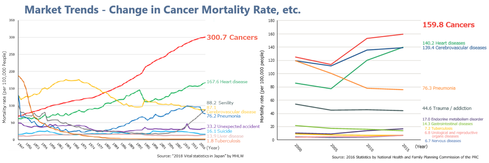 As the mortality rates from cancer increases as shown above, expectations for “new anticancer drug” and “cancer supportive care” are growing all over the world.