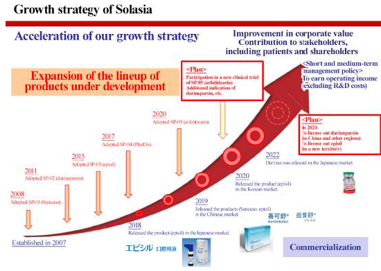 In summary, needs for cancer treatment in Japan and China are growing and there are great expectations for new anticancer drugs and cancer supportive care. Solasia Pharma is establishing business model and business strategy to incorporate such needs and boost earnings.