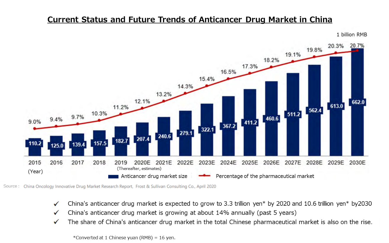 In addition, the anticancer drug market in China is over 3 trillion yen, accounting for more than 10% of the total pharmaceutical market, and it has grown at a CAGR of approximately 14% over the past five years.