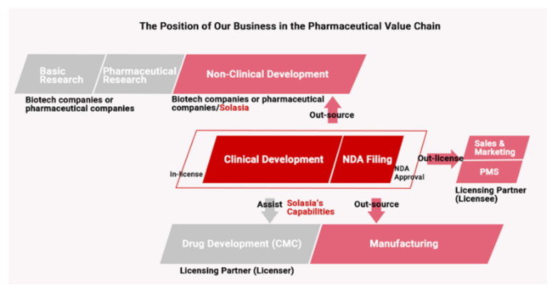 Solasia Pharma does not conduct basic research or preclinical trials but in-license assets and specializes in drug creation processes carried out subsequent to the clinical development phase. The most essential thing to achieve in the process of research and development toward commercialization of pharmaceuticals is to eventually obtain approval from the authorities. This requires skills and know-how in the stage of clinical development, especially clinical trials after phase II.