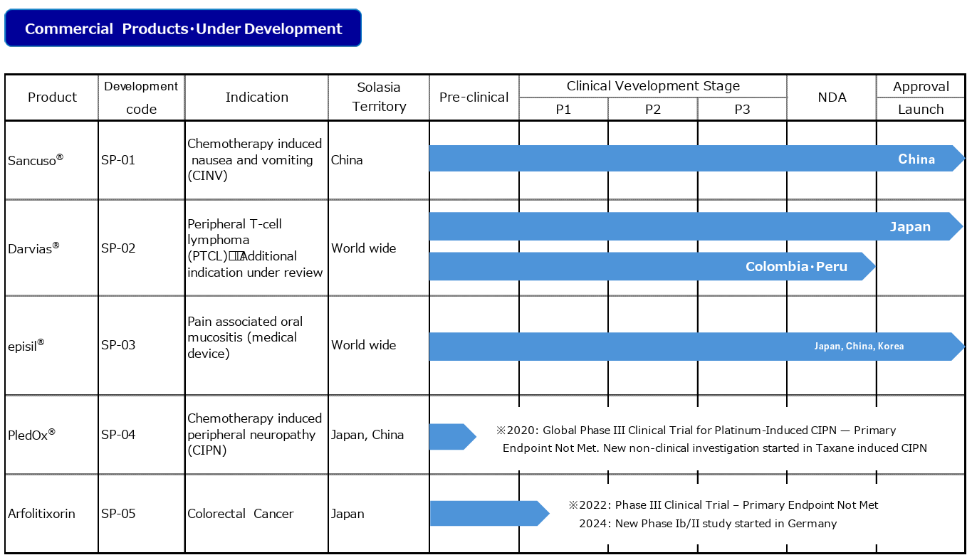 In November 2017, the company acquired the exclusive right to develop and sell for "PledOx® (SP-04)" in Japan, China, South Korea, Taiwan, Hong Kong, and Macau. In May 2018, “Episil® (SP-03)” was released in Japan, as the first product released by the company. Next, Sancuso® (SP-01) and Episil® (SP-03) were launched in China in 2019, followed by Episil® (SP-03) in South Korea in 2020, and DARVIAS® (SP-02) in Japan in August 2022, thus moving from the "development" stage to the "sales and commercialization" stage.