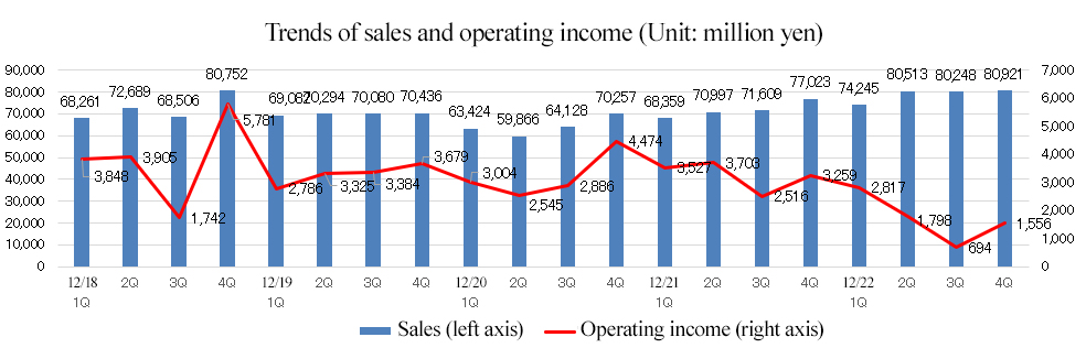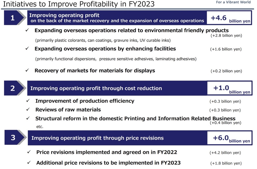 - In the term ended Dec. 2022, sales increased 9.7% year on year to 315.9 billion yen. Sales grew in major segments owing to the positive impact of foreign currency exchange rates and effects of price revision. The sales of packaging-related materials, such as liquid inks, pressure-sensitive adhesives and adhesives, grew especially overseas. Operating income decreased 47.2% year on year to 6.8 billion yen. Despite the expansion of sales (+800 million yen) and price revision (+19.9 billion yen), profit declined due to the rise in prices of raw materials (-21.1 billion yen), skyrocketing of energy costs (-1.8 billion yen), augmentation of expenses and logistics costs stemming from the increase in sales volume (-1.6 billion yen), decrease in quantity due to deterioration of market conditions (-3.3 billion yen), etc. It was impacted by the rapid decline of the market for LCD panels and electronics. Although price revisions contributed 25.2 billion yen during the two years of 2021 and 2022, it was not enough to offset the augmentation of costs caused by rising raw material prices of 33.3 billion yen. Net income stood at 9.3 billion yen, down 1.9% year on year. In step with the dissolution of the capital alliance with SAKATA INX, the company sold its shares and posted a gain on sales of investment securities of 5.6 billion yen.