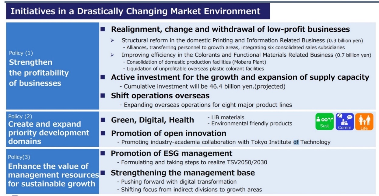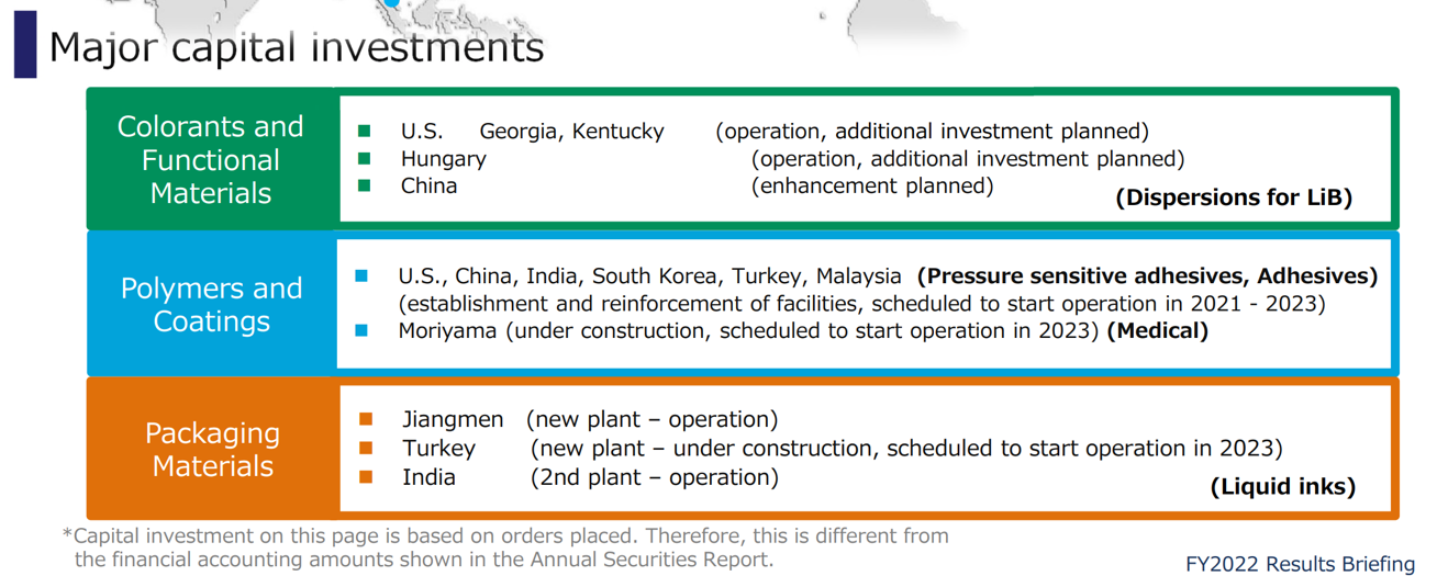 The company plans to construct/upgrade factories for each segment as follows: (1) For colorants/functional materials, factories for EV-related materials in Japan, China, the U.S., and Europe, (2) for polymers/coating, factories for pharmaceuticals (Moriyama Factory), new polymer synthesis (Kawagoe Plant), and adhesives (the U.S., China, and India) and (3) for packaging materials, factories in Turkey, India, China, and Indonesia.