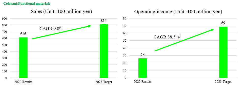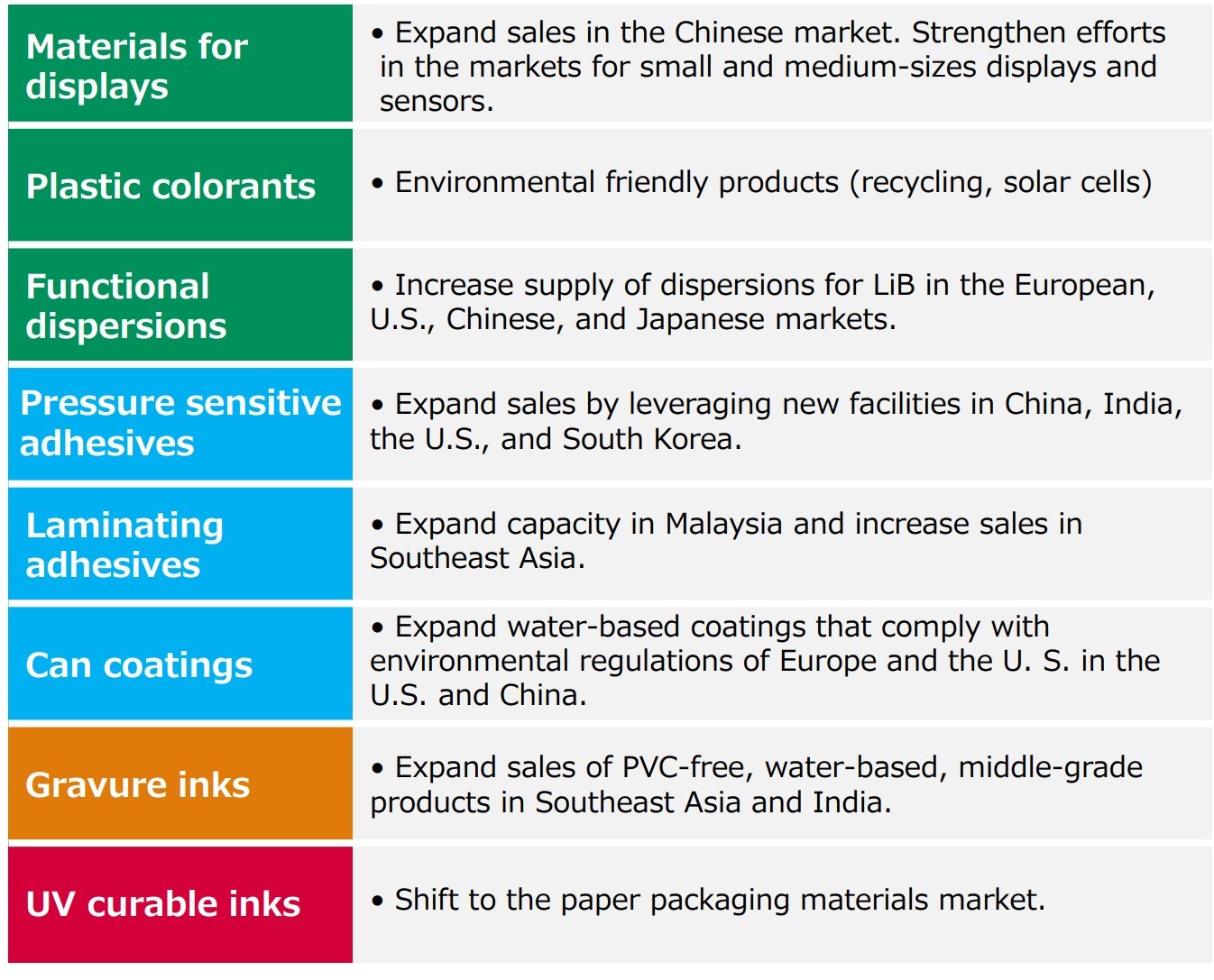 Colorant/Functional materials | Establish an earning pillar in growing markets -EV: To handle materials related to lithium-ion batteries -Digital: To expand the market share of resist inks for flat panel display (FPD) in China, and handle resist inks for image sensors and inkjet inks -Plastic colorants: To reorganize facilities and promote products with high added value |