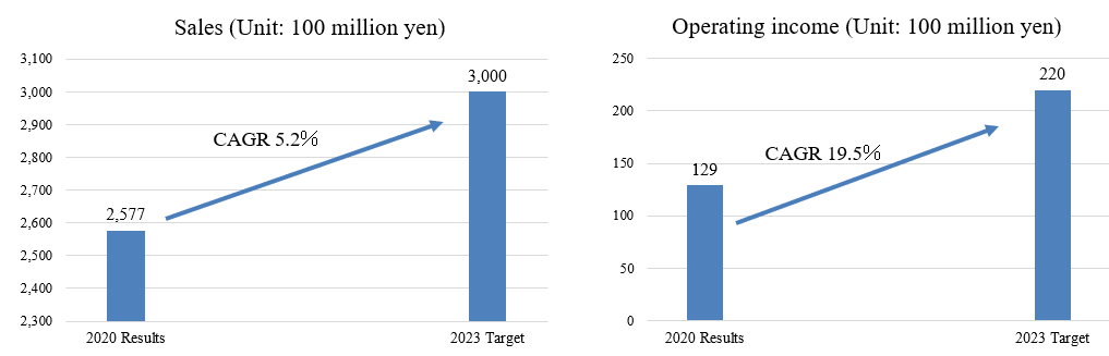 The company aims to achieve sales of 300.0 billion yen, an operating income of 22.0 billion yen, an operating income margin of 7% or higher, and a ROE of 7% or higher in the term ending Dec. 2023.