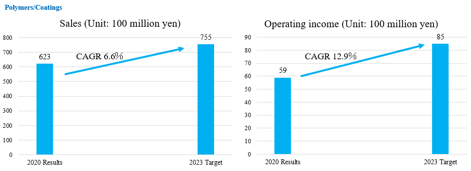 Polymers/Coatings | ◆ Overseas expansion of the adhesives business and the entry to growing markets with new polymers -Packaging/industrial materials: To expand business outside Japan, by enhancing its production capacity and enriching the lineup of environmentally friendly products -5G and IoT: To establish a position in the 5G market and enter the semiconductor market -Medical/healthcare: To expand and develop the lineup of related products |