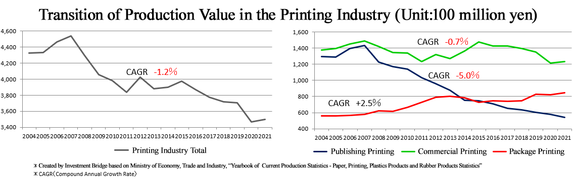 The production value of the Japanese printing industry is declining especially in the realm of publication printing of newspapers and magazines as a result of increasing digitization and aliteracy. Specifically, it fell sharply in 2020 due to the impact of the novel coronavirus etc. Also,in the realm of commercial printing, demands for posters, catalogues, fliers, POP, etc. were sluggish. On the other hands, printing on food and pharmaceutical packages and plastic containers is steadily increasing at the compound annual growth rate (CAGR) of 2.5% for 17 years from 2004 to 2021.