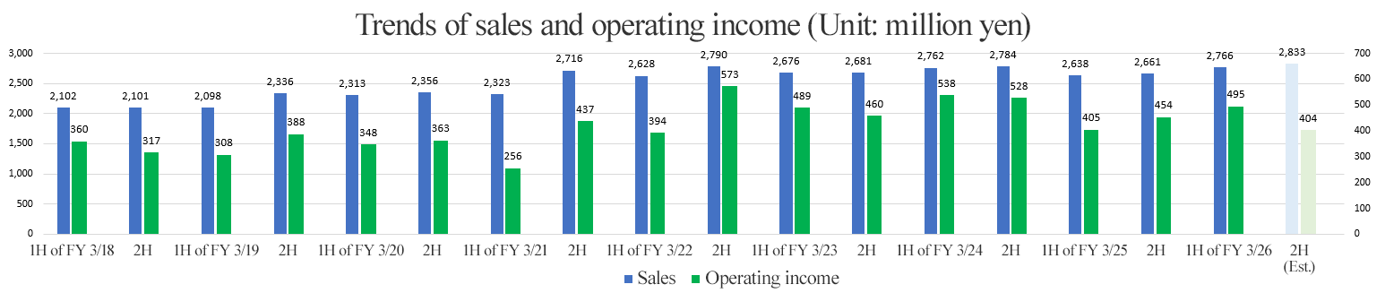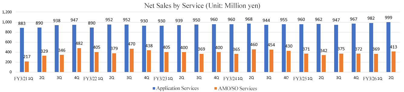 - The sales in the first half of the fiscal year ending March 2026 stood at 2,766 million yen, up 4.9% year on year, as application services performed steadily, and the performance of AMO and SO services was also favorable. Operating income reached 495 million yen, up 22.0% year on year. Gross profit grew 18.8% year on year due to price revision, the withdrawal from spot projects concerning AMO services with low profitability, etc. Gross profit margin rose 3.7 points, offsetting the augmentation of SGA expenses (up 14.8% year on year) caused by the increase in personnel costs and the provision for stock-based remuneration of executives in step with the adoption of the Employee Stock Ownership Plan (J-ESOP). Interim net income was 186 million yen, down 29.0% year on year. The provision for stock-based remuneration of 122 million yen was posted as an extraordinary loss. A downward revision was made to the earnings forecast in July 2025, but all kinds of profits exceeded the forecast.