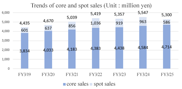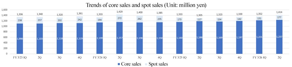 - Progress rate in the first half was 49.4% for sales and 55.0% for operating income. While sales remain almost at the same level as in previous years, operating income, which was revised downwardly a little, has reached a high level. As the company’s business model is based on recurring revenues, sales and profit can hardly be expected to significantly grow during a quarter. However, application services as well as AMO and SO services have recently been steady, and we would like to keep an eye on how much the company can accumulate sales while boosting profit through cost control at the same time. On the other hand, while the company is aiming for core sales of 5 billion yen in the fiscal year ending March 2026, they achieved core sales of 2,458 million yen in the first half, which means a progress rate of 49.2%. We would like to keep expectations for the progress from the third quarter, for the achievement of this goal.