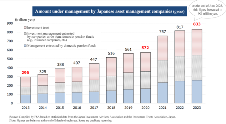 ① | The amount under management (gross) by Japanese asset management companies is approximately 800 trillion yen. It has been increasing every year, and at present, after bottoming out due to the novel coronavirus, it has increased 1.5 times in 3 years. It has also increased 2.8 times in 10 years. |