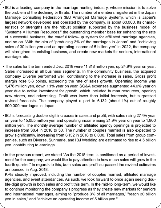 IBJ is a leading company in the marriage-hunting industry, whose mission is to solve the problem of the declining birthrate. The number of members registered in the Japan Marriage Consulting Federation (IBJ Arranged Marriage System), which is Japan's largest network developed and operated by the company, is about 60,000. Its characteristics or strengths are the robust position supported by the business model of "Systems × Human Resources," the outstanding member base for enhancing the rate of successful business, the careful follow-up system for affiliated marriage agencies, and so on. With the aim of "producing 3% of the marriages in Japan" and "achieving sales of 30 billion yen and an operating income of 5 billion yen" in 2022, the company will strengthen its existing business, and create new markets for seniors, international marriage, etc.