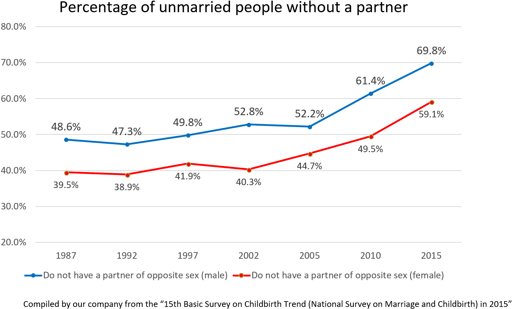 According to the "15th Basic Survey on Childbirth Trend (National Survey on Marriage and Childbirth) in 2015", among the unmarried people aged 18-34, the percentage of those without a partner is also rising year after year.