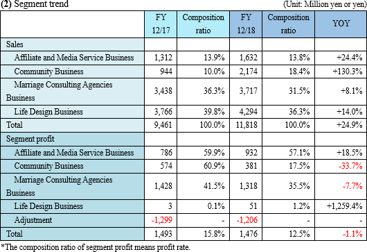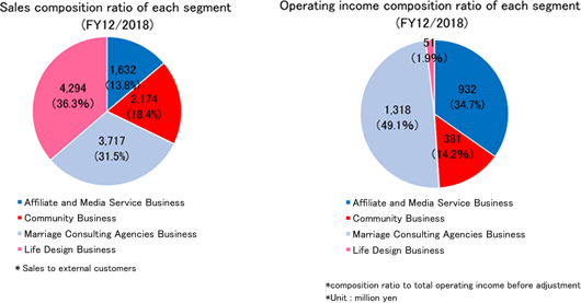 There are four reported segments: "Affiliate and Media Service Business," "Community Business," "Marriage Consulting Agencies Business" and "Life Design Business."
