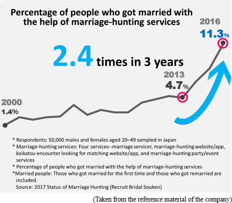 The marriage-hunting industry has met such needs, and the ratio of marriages actualized by marriage-hunting services has increased 2.4 times in three years.