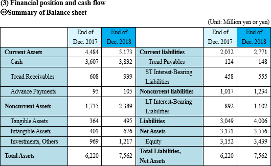 Treasury stock increased, and net assets grew 385 million yen from the end of the previous term to 3,556 million yen, due to the exercise of share options and a rise in retained earnings. As a result, equity ratio fell 4.3 points from the end of the previous year to 46.6%.
